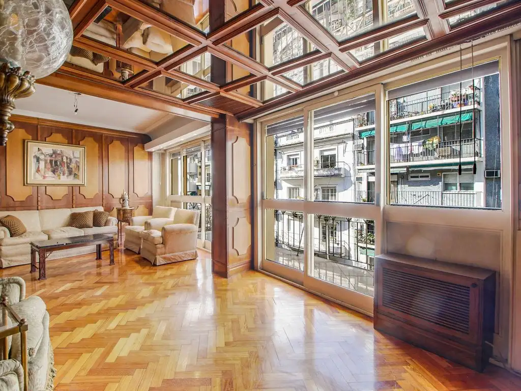 Edificio de categoria, Ingreso por palier privado y una 2da entrada con ascensor de servicio. Este hermoso departamento representa una construcción de acabados excelentes , 5to piso al frente, pisos de parquet, living en L con luz natural al frente con un amplio balcón corrido, dormitorios de generosas dimensiones, baños completos con bañera de mármol con bachas de lavado en bronce, griferia y apliques de categoría acorde la época, cocina de doble circulación y entrada de servicio, todo en impecable estado de conservación.