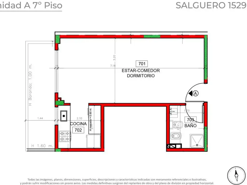 Amplio ambiente con salida a balcón aterrazado al frente con paneles de vidrio. Cocina con anafe a gas y muebles completos de diseño moderno, mesada de granito. Baño completo. Persianas de madera. Piso de porcellanato símil madera. Placard con interiores instalados. Calefacción por radiadores, con calera dual individual. Instalación para aire acondicionado tipo “split”. Baño y cocina con revestimiento cerámico de primera línea marca San Lorenzo y griferías FV línea Margot.