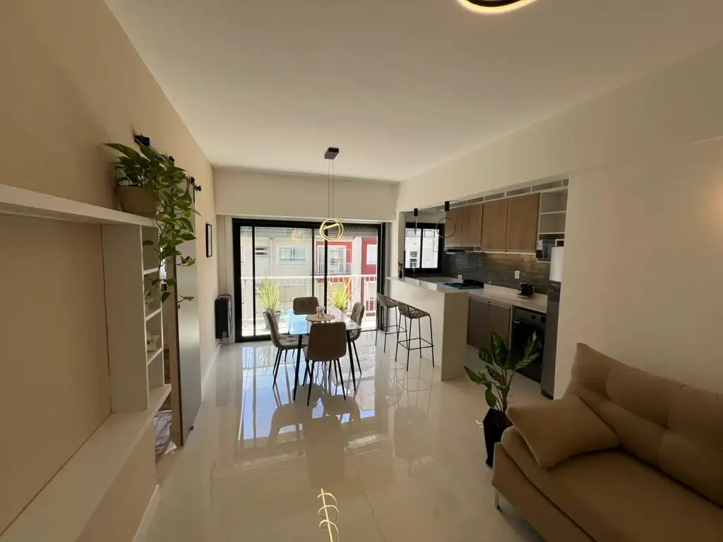 Cocina integrada con barra desayunadora , equipada con alacenas a medida y electrodomesticos a estrenar , ademas cuenta con ventilacion natural