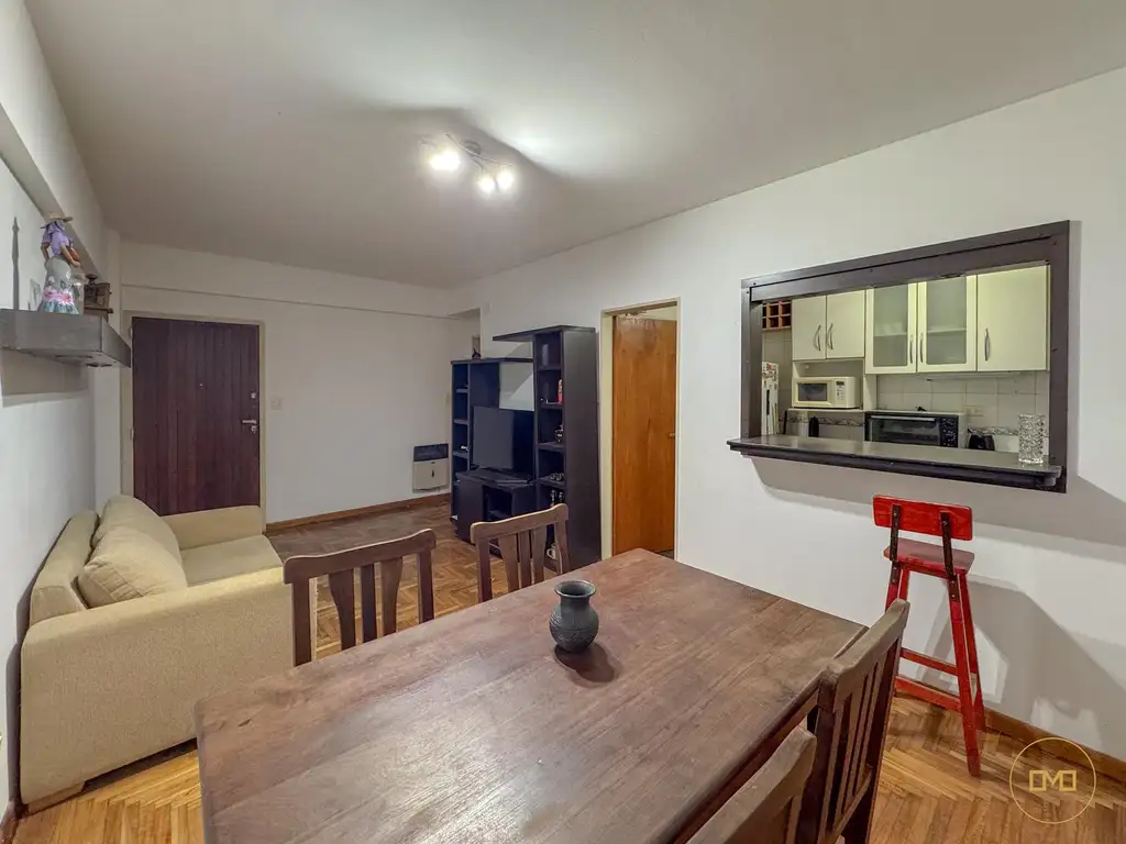 Cocina completa con barra, comedor diario y amplio living a balcón.