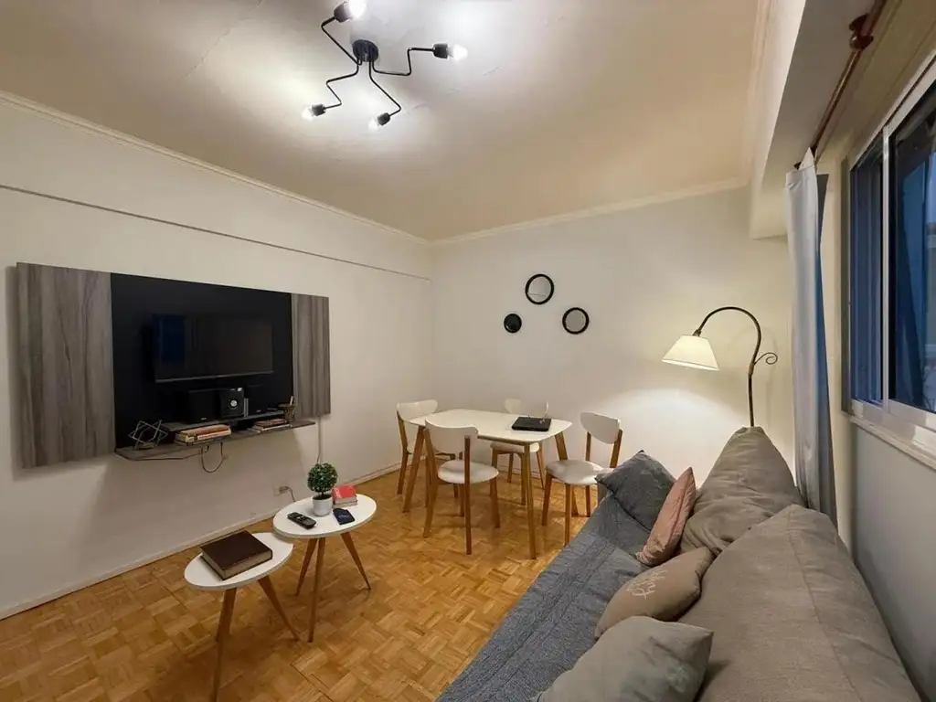 - Living-comedor: con sillón cama, mesa con 4 sillas, mesa ratona doble, rack con TV, lámpara de pie, detalles deco. Aberturas de aluminio nuevas.