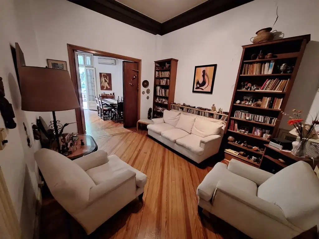 Luego se accede a través de una doble puerta de madera divisoria a otro amplio espacio social con ventanal al balcón. Puede ser utilizado como living o como comedor principal. Posee pisos de pinotea, molduras de estilo en el cielorraso y puerta con acceso al sector de la cocina, baños y dormitorios. Posee Aire Acondicionado.