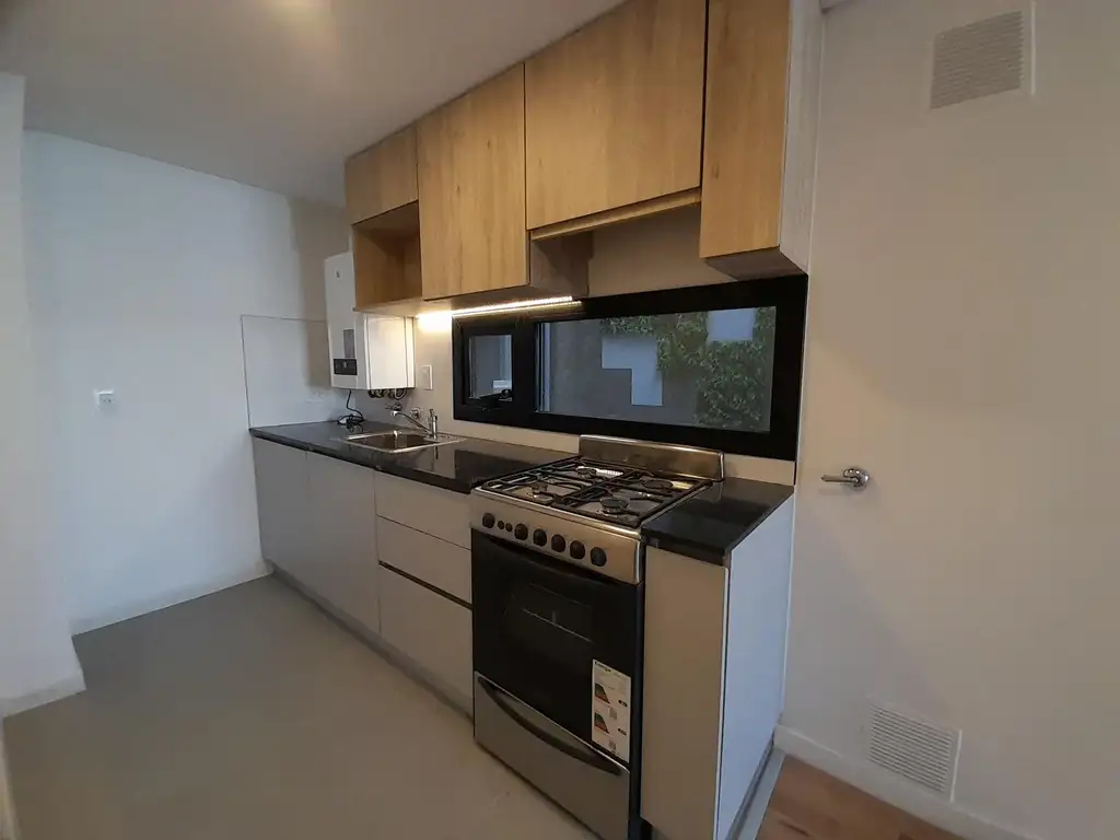 Pisos de porcelanato en cocina y baño. En estar, comedor y dormitorios cuenta con piso ingenieril.