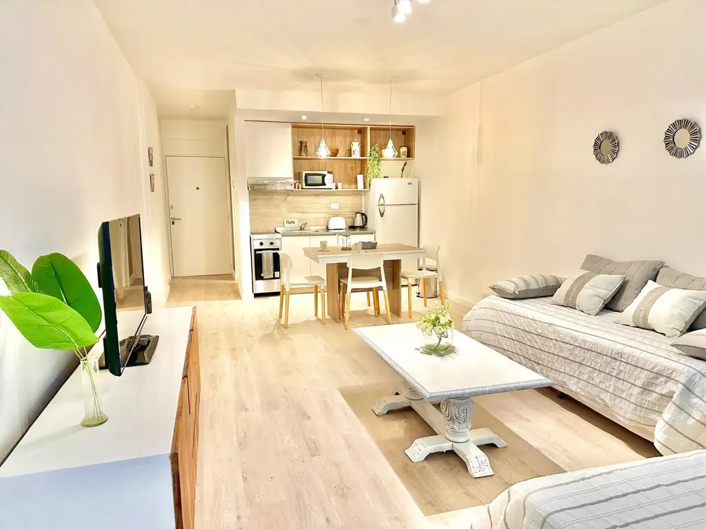Esta totalmente equipado con microondas, cocina y horno, aire acondicionado, heladera con freezer, pava eléctrica , tostadora, secador de cabello,plancha,wifi y televisión por cable. Tiene ropa de cama y toallas. En la habitación principal tiene una cama doble y en el living dos camas de una plaza. Su disposición es al frente . Tiene ventanas con doble vidrio para aislar los sonidos. Con una decoración cálida y moderna que invita a pasar una hermosa estadia.