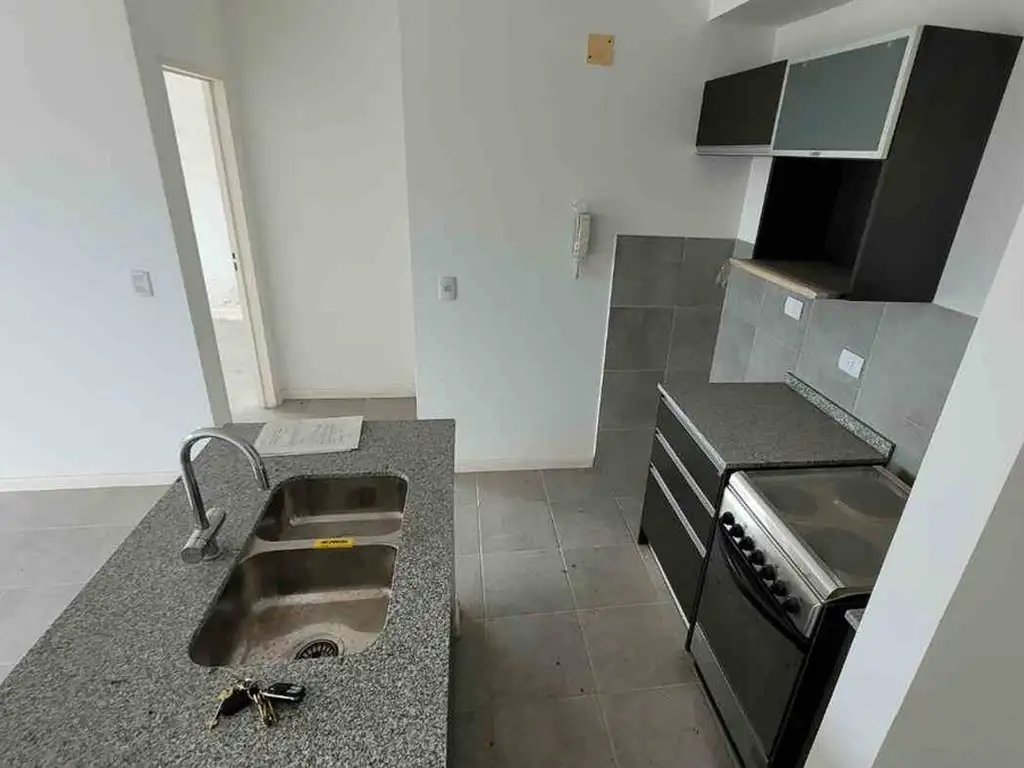 El departamento cuenta con una cocina integrada completa con muebles y barra, living comedor con acceso al balcón, baño amplio con bañera y dormitorio con placard.