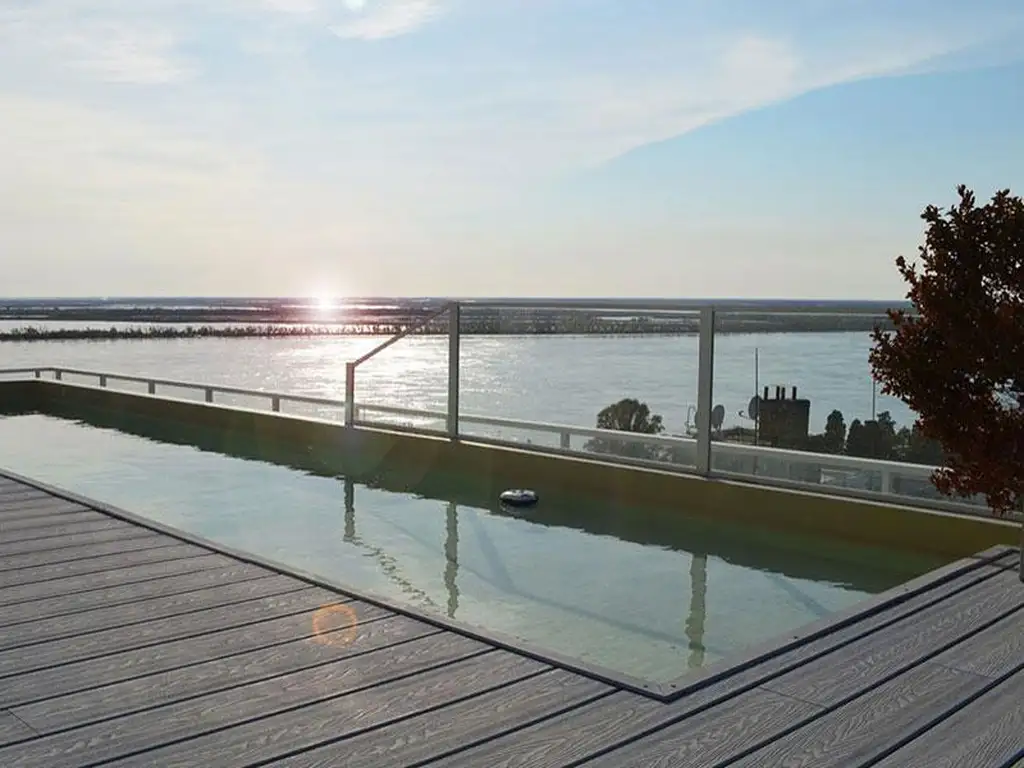 Piscina con solarium y deck de madera con vista panorámica al río Paraná. | Quincho con doble parrillero y salón de juegos con vista panorámica al río. | Pileta interior con hidromasaje y vista panorámica al río.