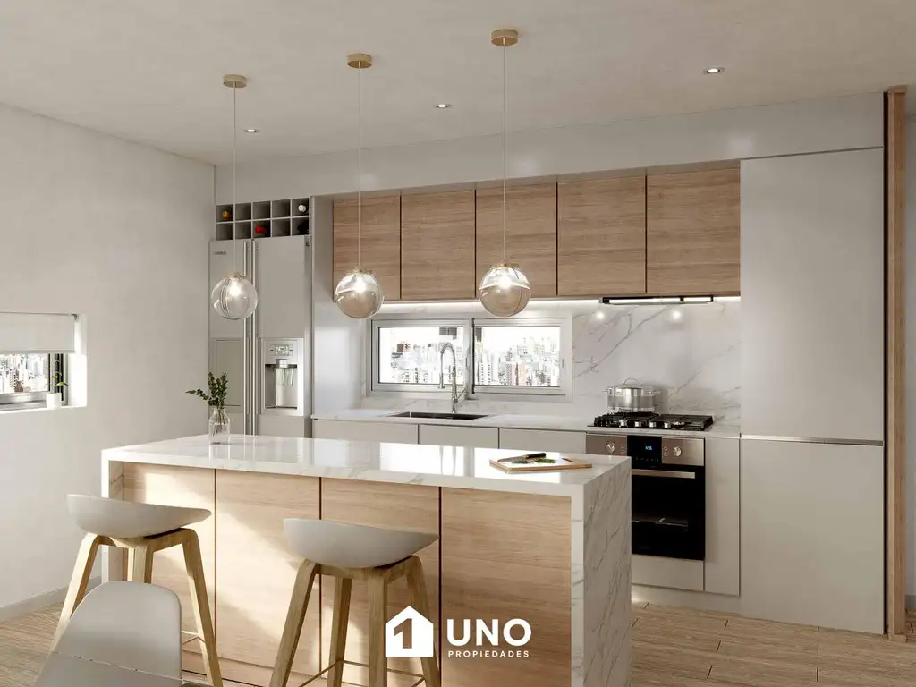 La unidad se organiza en un estar/comedor con salida a un balcón terraza al norte, con cocina integrada con barra desayunadora, ubicada al ingreso.