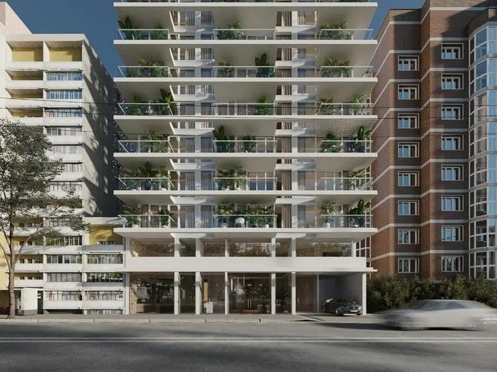 dos locales comerciales en Planta Baja, hall de ingreso de alto nivel, espacio de estacionamiento y bauleras.