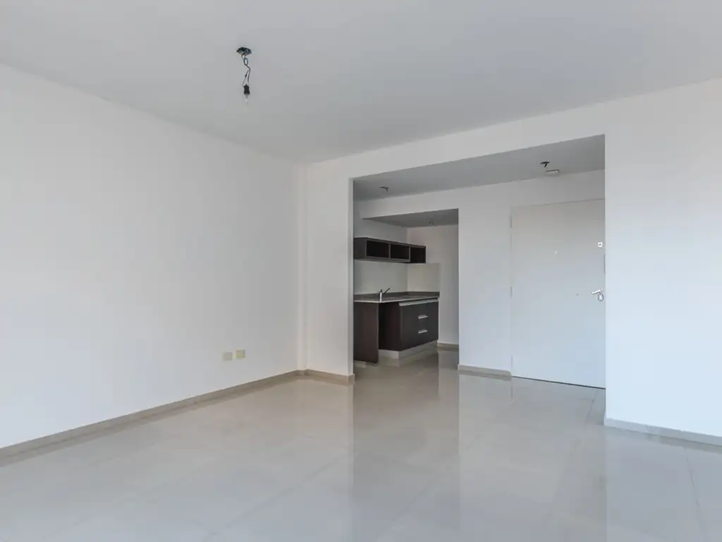 Amplio ambiente abierto con una hermosa cocina con pisos de porcelanato, terminaciones de calidad, baño con artefactos de la marca Ferrum, con ventana. Balcón super amplio y funcional.