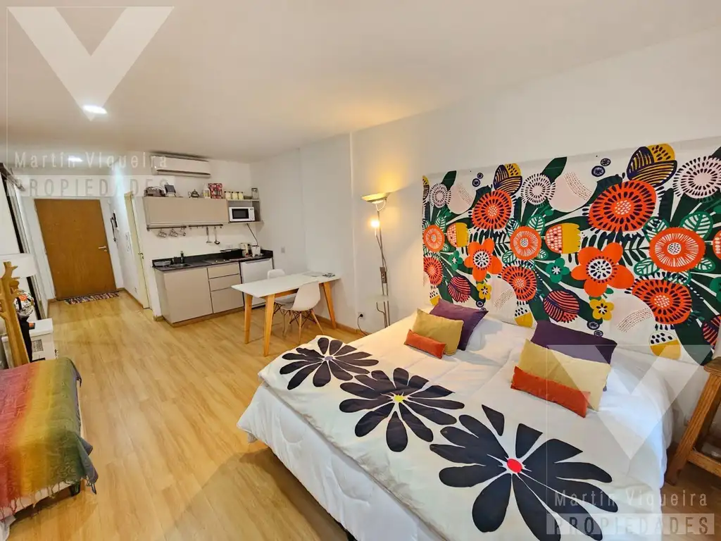 Departamento de un ambiente al frente absolutamente equipado. La unidad funcional consta de hall de ingreso con placard empotrado de 3.06 x 2.00, ambiente con cocina integrada de 6.40 x 3.20 mts y baño completo de de 2.88 x 1.65 mts..