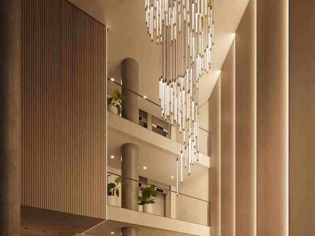 Imponente lobby de triple altura con jardín de ingreso.