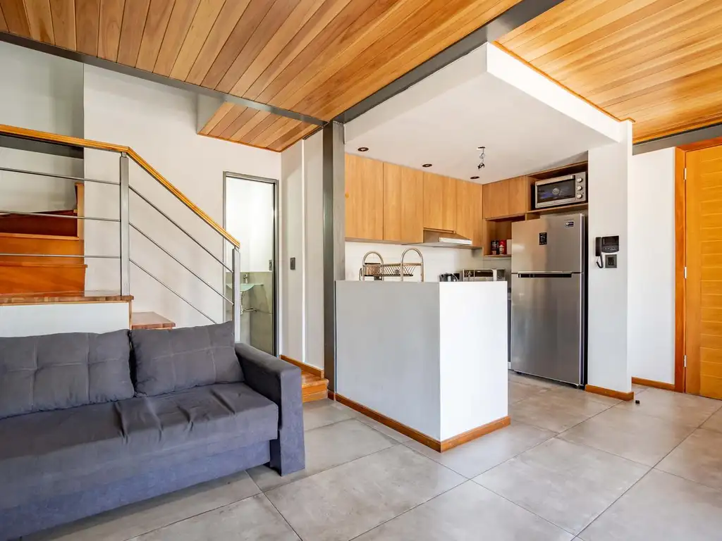 Descripción: Departamento duplex externo con balcón al frente, desarrollado en dos pisos. Ingreso a living comedor con balcón al frente que aporta una iluminación natural por su orientación este. Cocina integrada con amoblamiento completo y toilette. En el piso superior se desarrollan dos dormitorios con placares empotrados completos, el principal con salida al balcón, más un baño completo. Pisos y resvestimientos de porcelanatos, en dormitorios piso de madera entablonado. Aberturas de aluminio linea módena con DVH. La unidad cuenta con alarma inalámbrica con sensores interiores y protecciones para balcón. Aires acondicionados tecnología inverter en todos los ambientes.