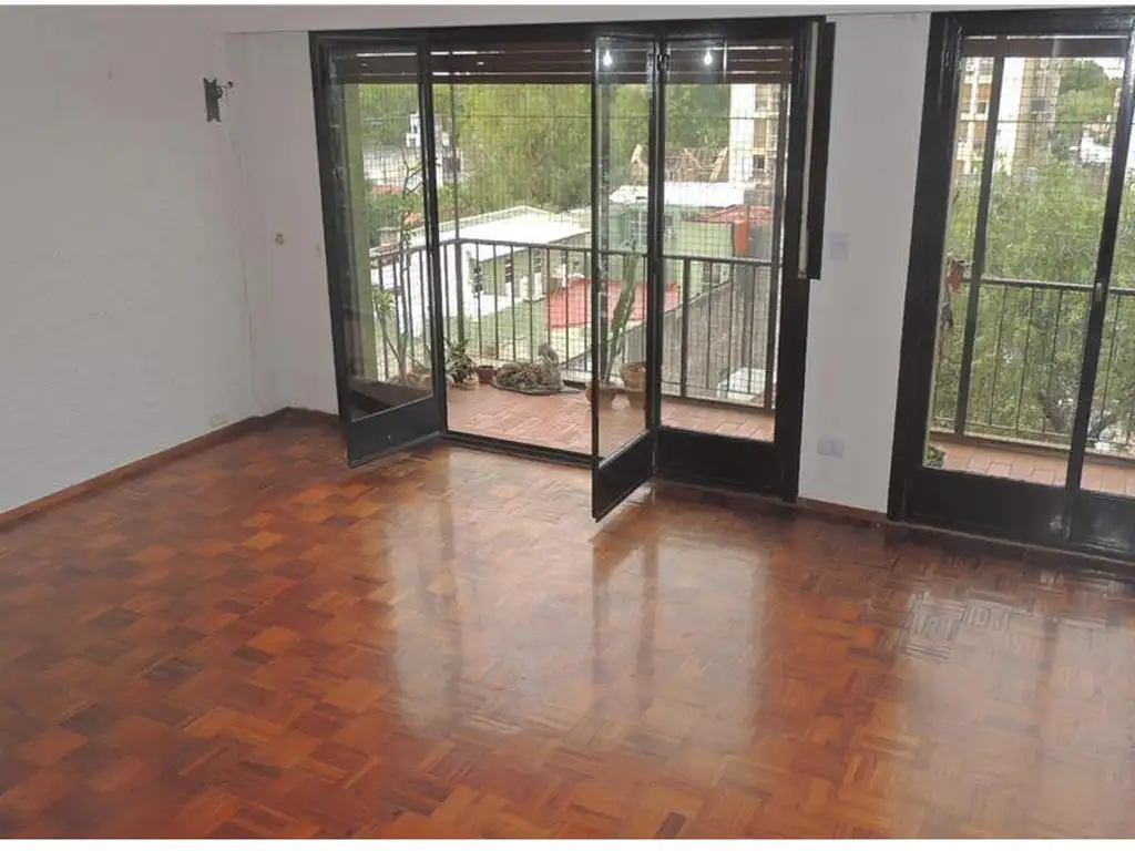 Amplio y luminoso living comedor con piso de parquet, con puertas vidriadas al balcón corrido, vista abierta.