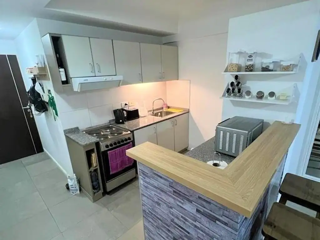 Al ingresar tenemos la cocina completa integrada con Alacena y muebles bajo mesada, junto con la cocina cuenta con el espacio de living comedor, y tiene una división para lograr un dormitorio y posee balcón. También tiene un baño completo con bañera.