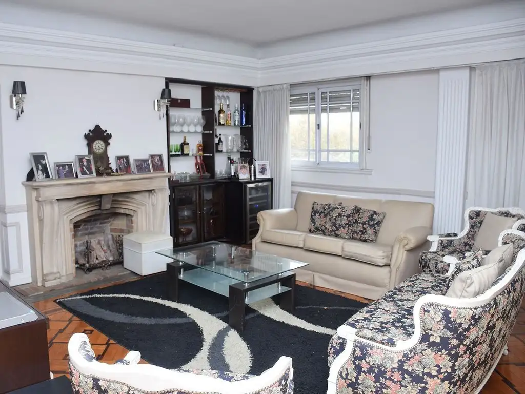 El LIVING COMEDOR tiene pisos de madera originales con decoración de categoría y de época. Ornamentación en techo y paredes y un hogar.