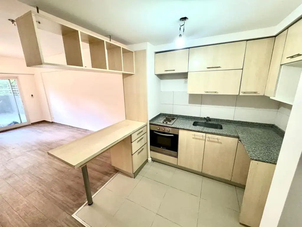 El Departamento: Monoambiente con balcón aterrazado y/o patio al frente. Piso: 1 Superficie total: 45m2, Superficie Cubierta: 33 m2 Superficie Descubierta:12m2. Excelente Luminosidad. Baño completo. Moderna cocina integrada con artefacto anafe y horno empotrado de acero inoxidable, muy buen mobiliario de guardado sobre y bajo mesada. Coneccion para Lavarropas. Piso de Porcelanato en ambiente principal. Aire acondicionado Frio Calor!