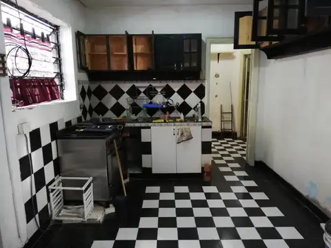 Pisos de cerámica damero blanco y negro en cocina, baño y sectores comunes.