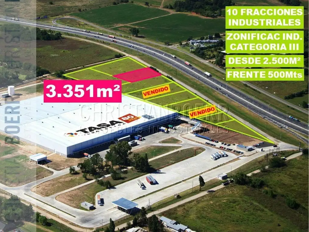Esta fracción en particular tiene 3.351m², el asfalto llega al vértice y tiene un frente de 42 mts sobre autopista. Se permite construir un máximo de 2.010m² en PB y 3.351m² cubiertos totales (FOS 60%, FOT 100%). Posibilidad de anexar un lote lindero de aprox 5.747m² y otro de 5.599 m²
