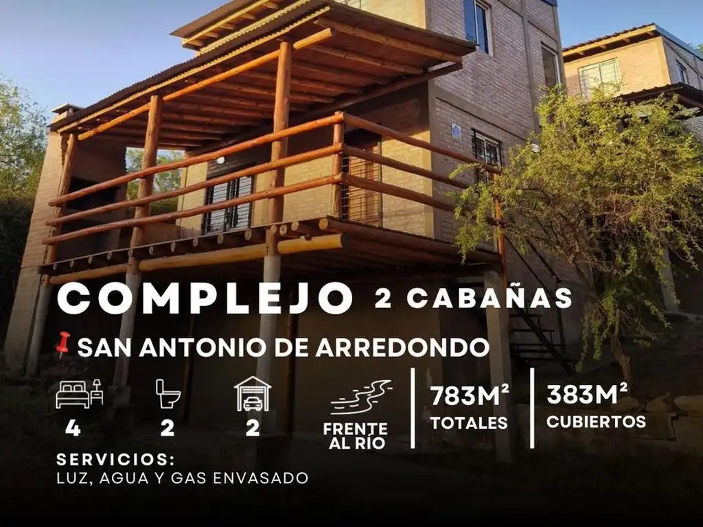En esta oportunidad te traemos este espectacular complejo turístico frente al rio San Antonio compuesto de dos cabañas gemelas de material tradicional y hermosos detalles en madera totalmente equipadas hasta 6 personas cada una ( 12 PLAZAS EN TOTAL ). Con amplio terreno para seguir construyendo. Ubicadas en un entorno natural con paisaje a las sierras de Córdoba a 10 minutos del centro de Carlos Paz.