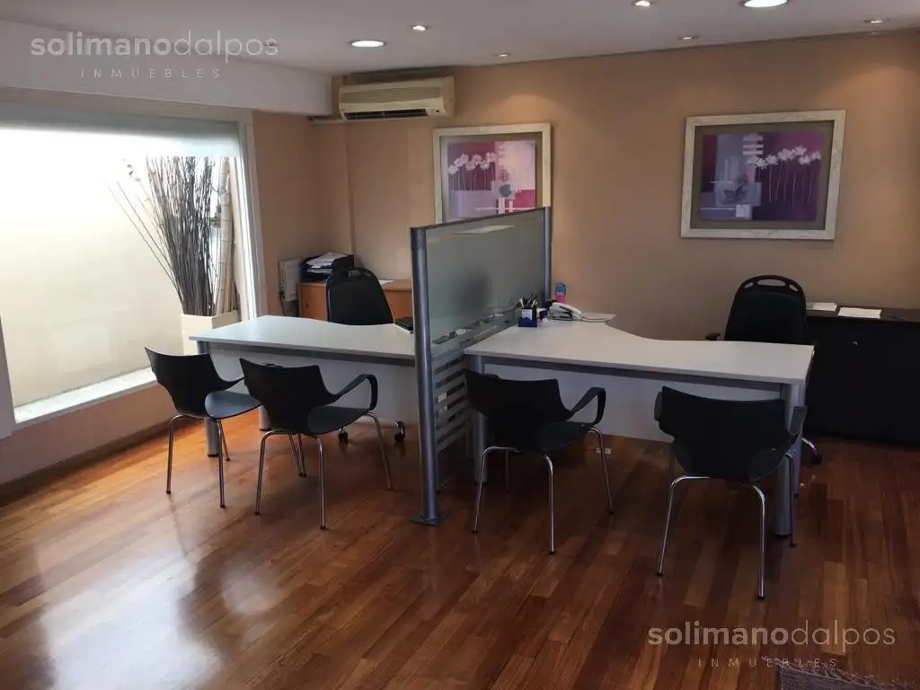 Oficina desarrollada toda en planta baja, varios puestos de trabajo todo con pisos en madera tarugados, mas un privado, baño con ducha, calefacción individual por picos de gas y además aire split frió/ calor.-
