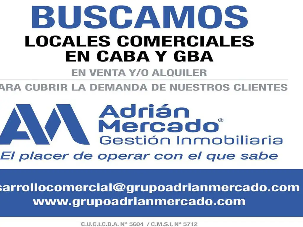 Los datos contenidos en esta publicación (precios, medidas, superficies, imágenes, etc.) sólo se proporcionan con fines informativos y no generan ninguna obligación contractual para Adrián Mercado Gestión Inmobiliaria S.A. Adrián Mercado Real Estate no asume responsabilidad derivada del uso incorrecto, inapropiado o ilícito de la información publicada. Adrián Mercado Real Estate no garantiza explícita ni implícitamente la exactitud de la información publicada. Toda la información deberá ser confirmada oportunamente con los correspondientes documentos registrales. La información contenida en la presente publicación está sujeta a modificaciones sin previo aviso. Se prohíbe cualquier reproducción total o parcial, por cualquier medio, sin la previa autorización de Adrián Mercado Real Estate. CUCICBA Mat. No 5604 Leandro Mercado | CMCPSI Mat. No 5712 Adrián Mercado
