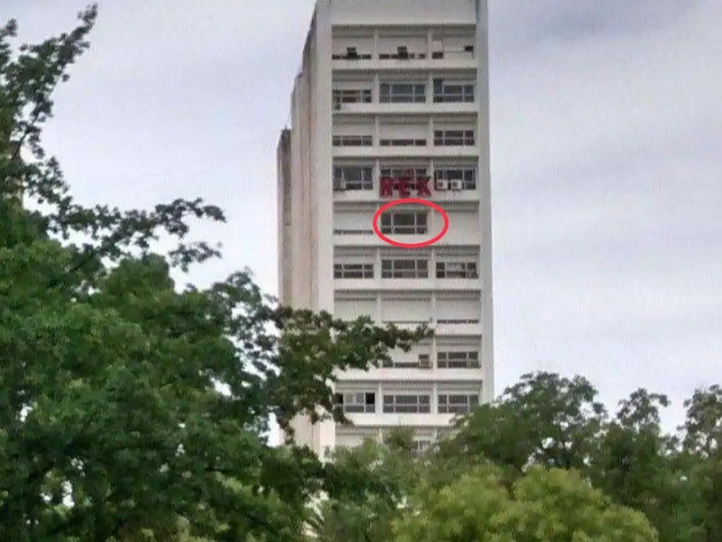 Con un ventanal, de pared a pared, desde la rodilla al techo. con vista a la plaza Rivadavia.