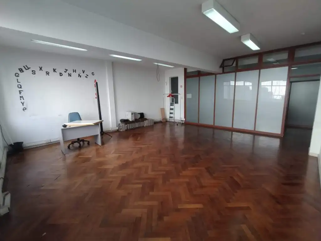 SECTOR 1°: Ambiente Amplio con División. En este ambiente quedan conformados 2 Espacios, uno de 5,00 x 3,50 y el otro de 5,00 x 2,40, y cada uno tiene su Puerta de Entrada independiente a la unidad desde el Palier Común. Estos Dos Espacios tienen una División Parcial de Piso a techo de Madera con Vidrios Opacos. Además, hay un Espacio Extra de 1,50 x 2,00 mts
