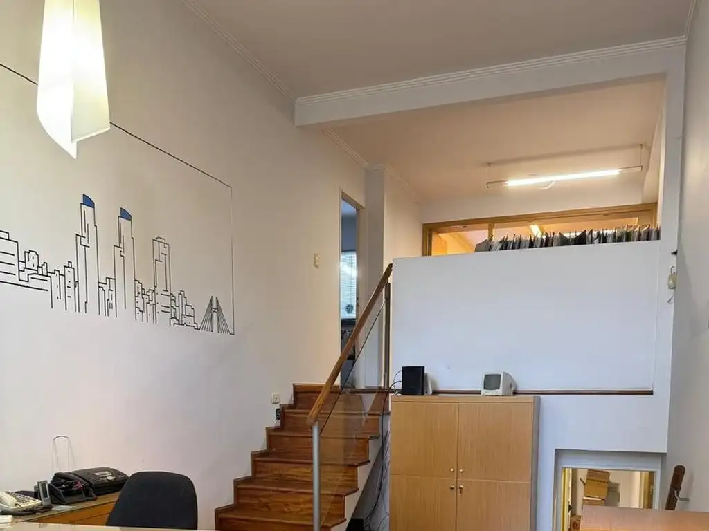 - Ubicado en planta baja de edificio, al frente, cuenta con tres niveles, en el ingreso hay una recepción, en planta Subsuelo Oficina principal y sala de reuniones, en planta alta sala de trabajo, oficina abierta, cocina comedor y baño completo con ducha.