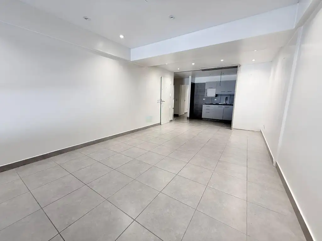 Amplio ambiente principal de trabajo o sala de espera, con ventanal, cocina equipada con muebles bajo mesada y alacena.