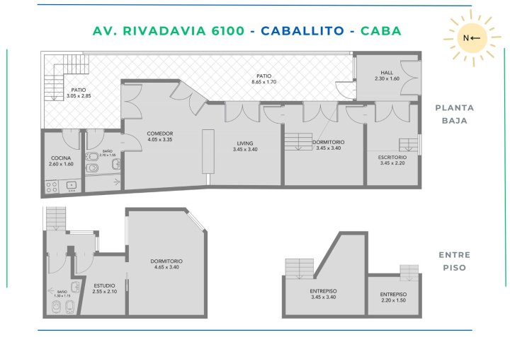 Hall de recepción. Acceso a oficina o 1º dormitorio con entrepiso. Patio con techo de en año 2020. Dormitorio principal con entrepiso. Living de doble altura conectado a comedor con entrepiso. Baño completo. Cocina independiente. Lavadero en patio. En 1º piso: 3º dormitorio, estudio y baño. Estufa TB y 2 aires F/C. Apto profesional. Ubicado en Caballito, cerca de subte A (Carabobo) y Av. Pedro Goyena.