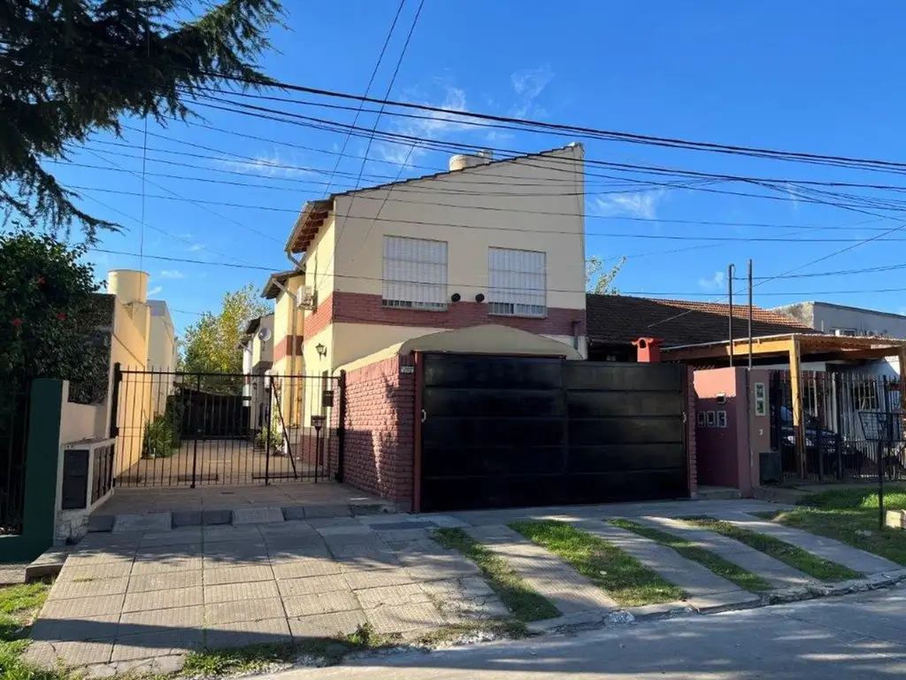Patio al frente con parrilla y doble entrada de auto.