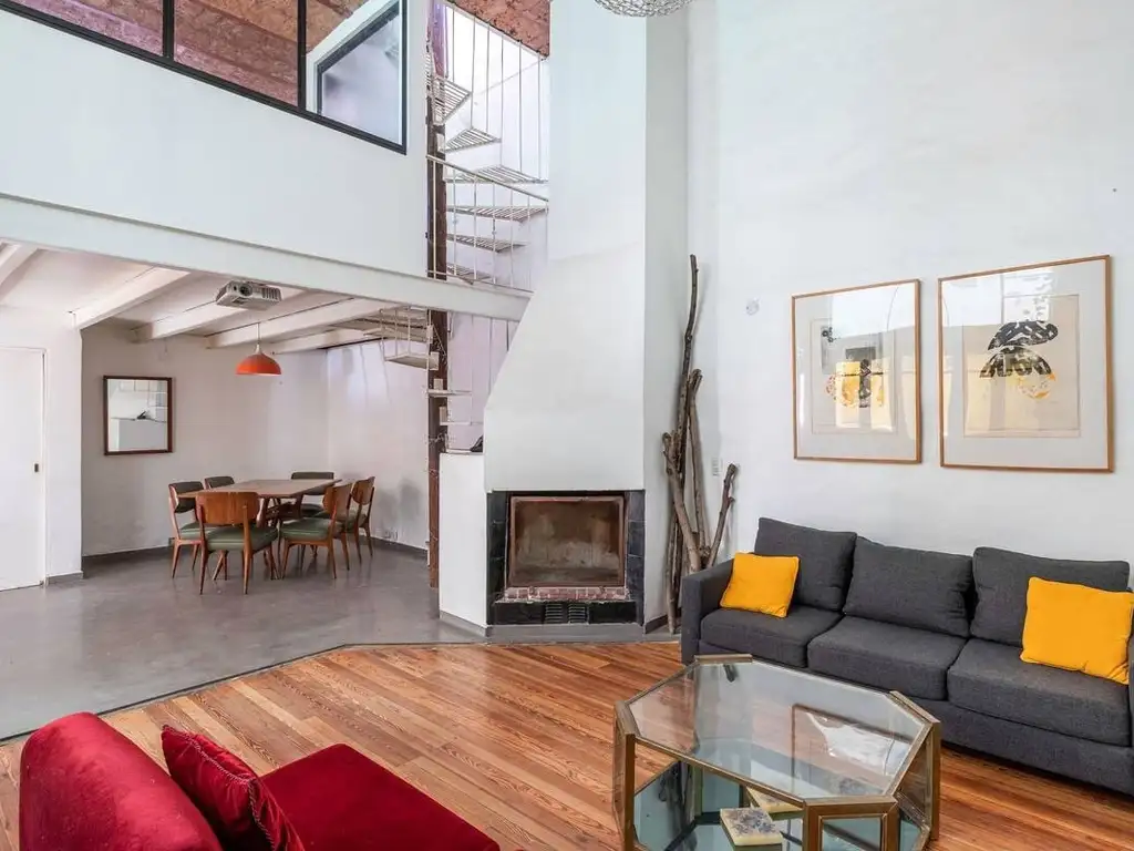 Living con chimenea y salida hacia patio interno privado.