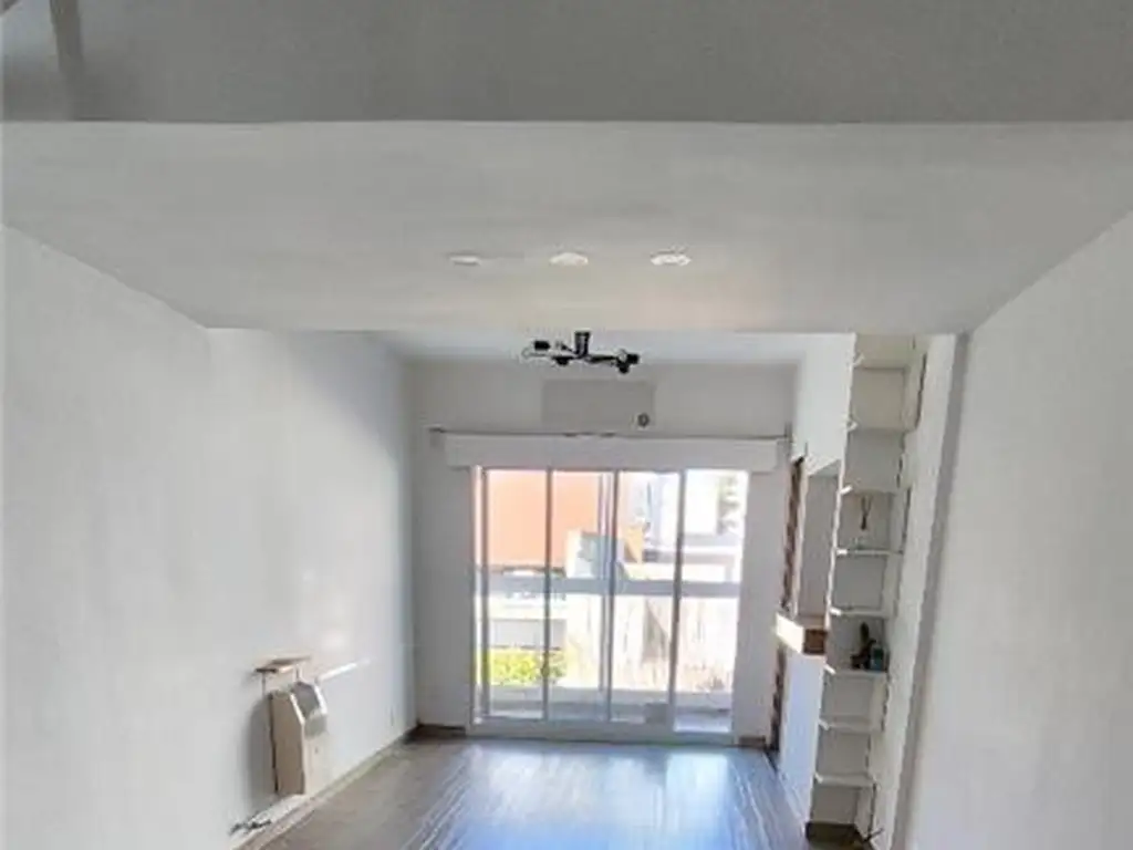 1ra planta: living comedor de 8 x 3 con salida a balcón, hoy con cerramientos de vidrio, a contrafrente abierto y verde.
