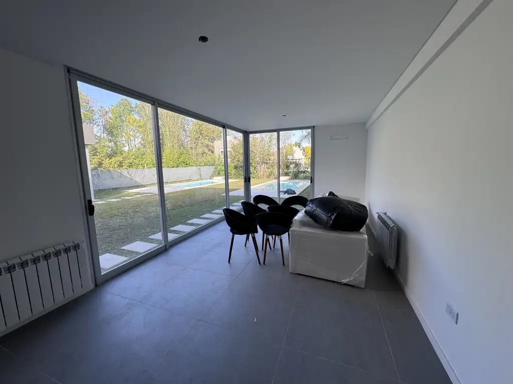 En PB, cocheras, parrillero con frente acero inoxidable, bacha, pileta de 2,8 mts x 8,50 m2, con bomba de filtrado. Ingreso a la casa, toilette, lavadero independiente, sector exterior para guardados y caldera dual, cocina con isla equipada con anafe, horno y extractor. Muebles alacena y bajo mesadas.. sector estar comedor con grandes puertas ventanas al jardín..