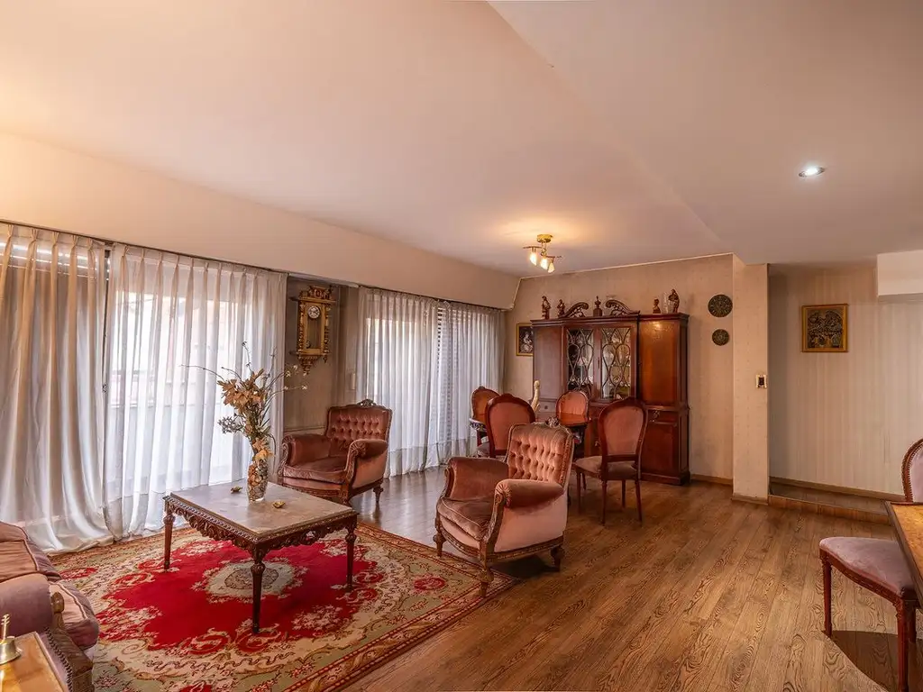 • Living-comedor con piso símil madera y ambientado con muebles de estilo, gran balcón a la calle.