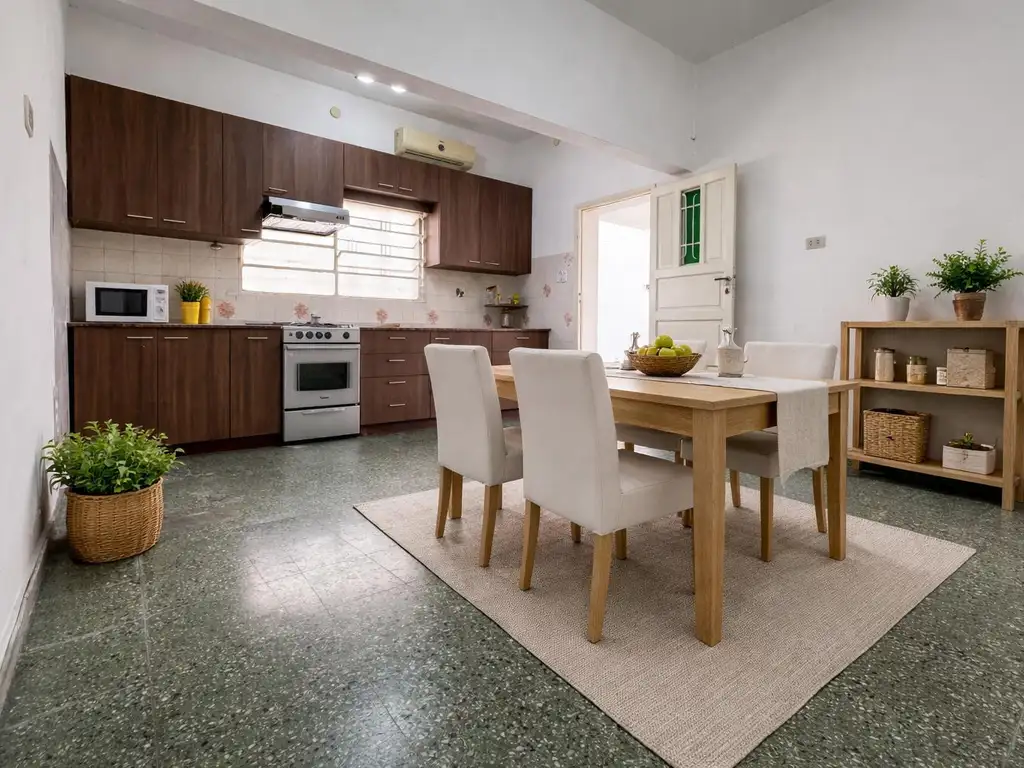 La cocina comedor es amplia, equipada con muebles nuevos y excelente espacio de guardado. Desde allí se accede a un patio techado, con cerramiento móvil que permite abrir o cerrar según la necesidad, ideal para usar todo el año. En el patio se encuentra el lavadero y, mediante escalera, se accede a la terraza, con posibilidad de quincho y un gran espacio al aire libre, perfecto para disfrutar reuniones familiares o con amigos.