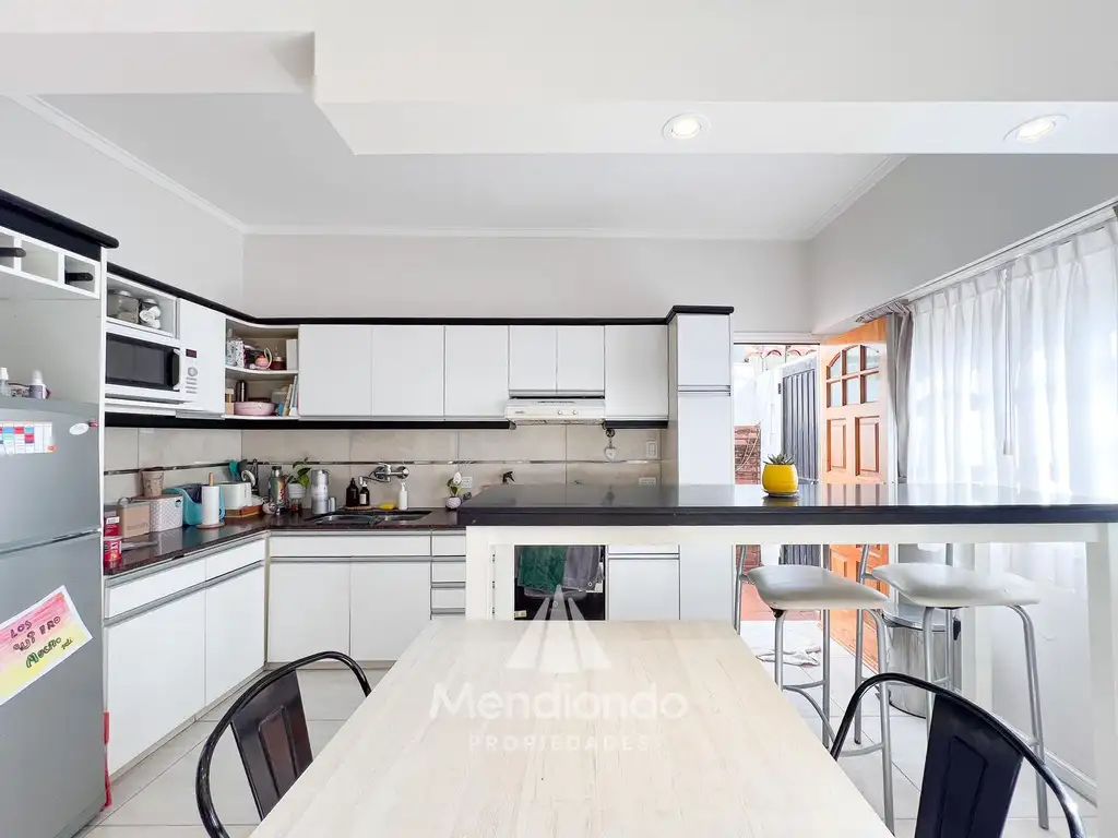 Cocina integrada, equipada con barra desayunadora, y salida directa a un patio de 16 m2.