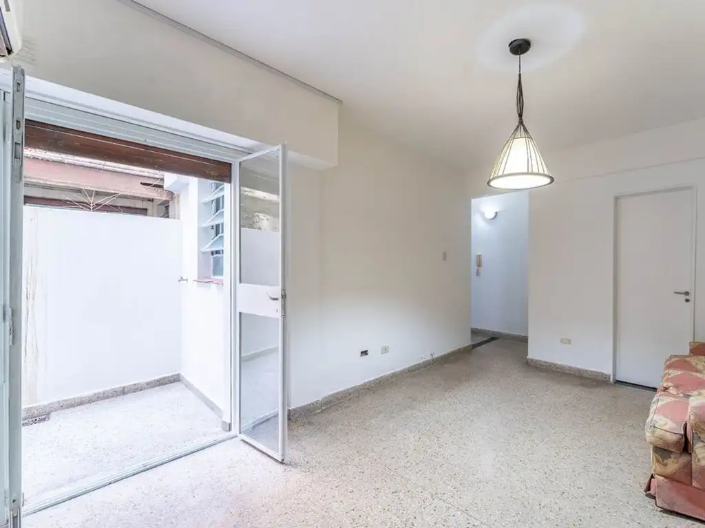 Distribución funcional con ingreso por hall que incluye placard de guardado. Cocina separada con ventana hacia patio. Living comedor con puerta balcón que comunica al patio, permitiendo ingreso de luz natural. Dormitorio con placard amplio y gran ventana. Baño completo. Piso de parquet en óptimas condiciones.