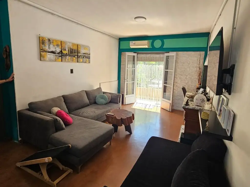 Amplio living comedor aireado y luminoso con chimenea a gas y aire acondicionado frio solo con salida al balcón.