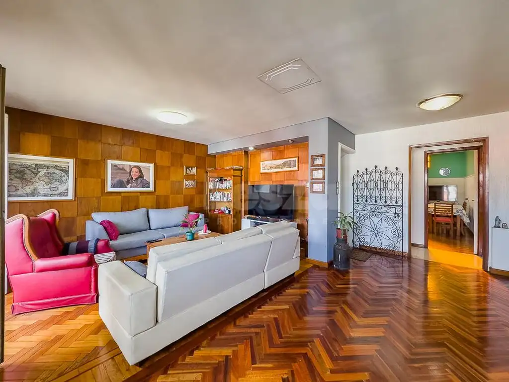 Gran living comedor en "L" con pisos parquet, balcón al frente, cocina comedor diario, 3 dormitorios con pisos parquet, baño completo, lavadero cubierto con baño auxiliar, terraza con quincho con parrilla y cuarto de enseres.