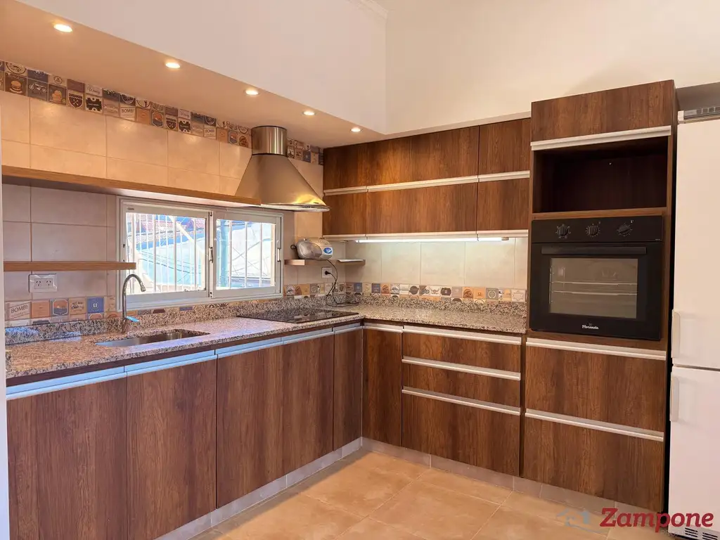 Cocina semi-integrada con bajo mesada y alacenas, anafe y horno eléctrico.
