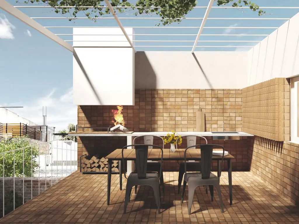 piso y revestimientos de ladrillo, pérgola metálica.
