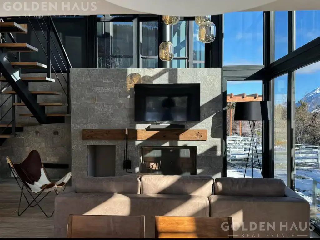 - Living: Amplio, luminoso, con ventanales de piso a techo en PVC, hogar a lena revestido en