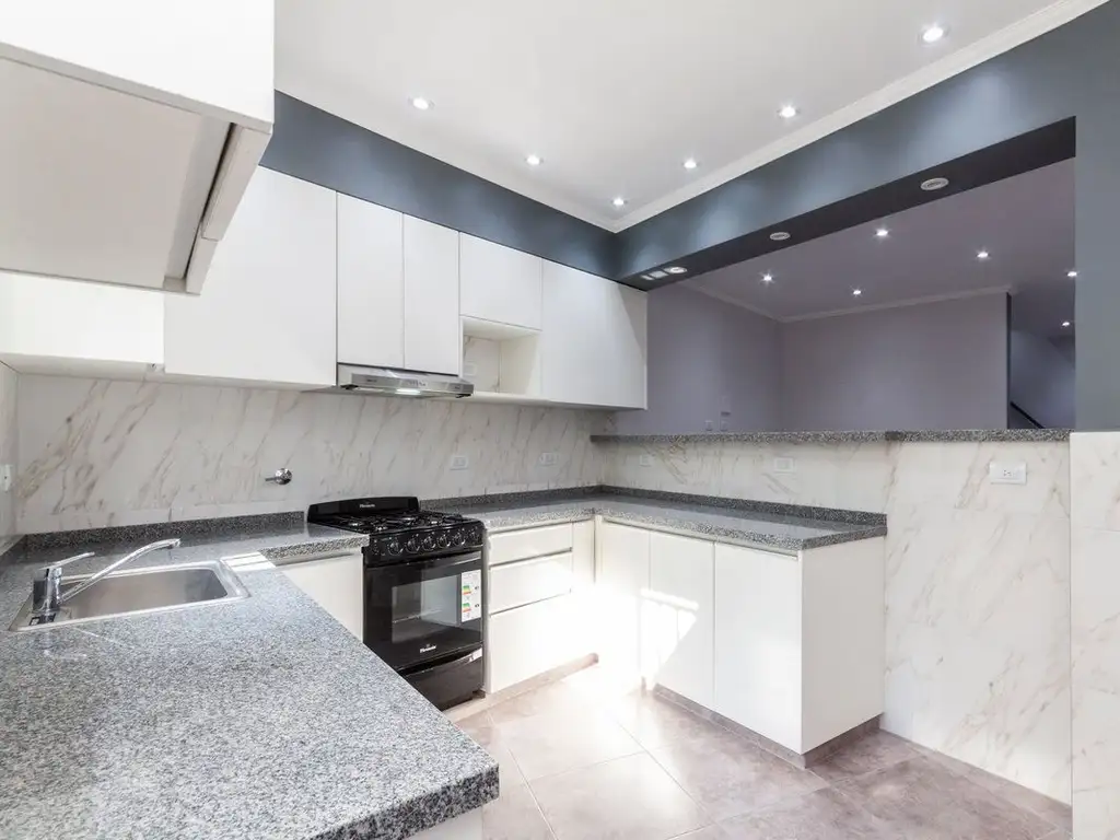 La cocina está equipada con mesada de mármol y muebles de melamina. Los pisos de cerámica gris perla aportan un estilo sobrio y moderno. Las aberturas de chapa plegada en espesor 18 brindan resistencia y seguridad. Además, cuenta con aire acondicionado instalado.