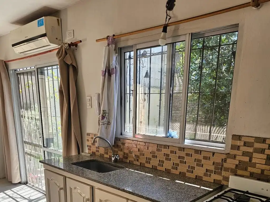 En planta baja nos recibe un patio amplio con arboles. Desde allí ingresamos al living (2,20 x 5,20), un ambiente luminoso que conecta con la cocina comedor (2,80 x 2,80), ambos con vista al patio y un ventanal corredizo que aporta ventilación y luz natural. En esta planta también encontramos un baño completo con ducha (1,50 x 2,80) y un dormitorio espacioso (3 x 2,20).