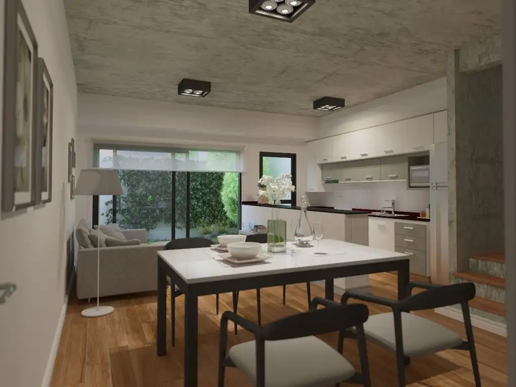 • Planta Baja: Living-comedor con cocina integrada y salida a jardín propio, toilette de recepción