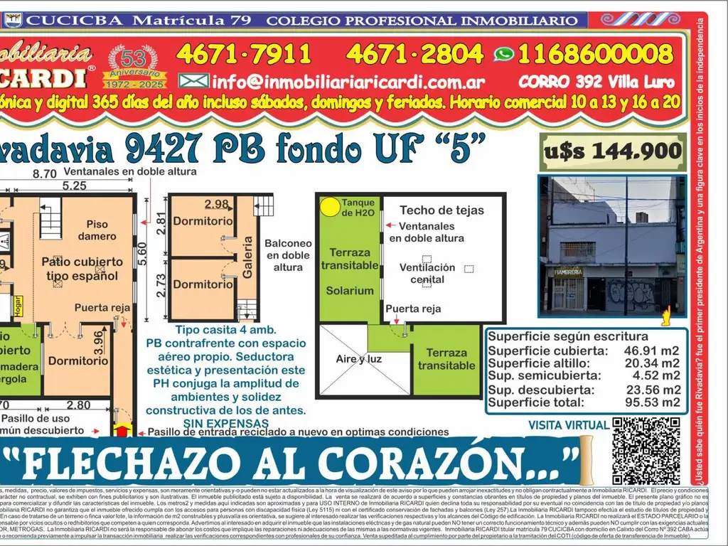 Consideraciones de lado se trata de un tipo casita 4 amb. PB contrafrente con espacio aéreo propio. Con una seductora estética y presentación este PH conjuga la amplitud de ambientes y solidez constructiva de los de antes.