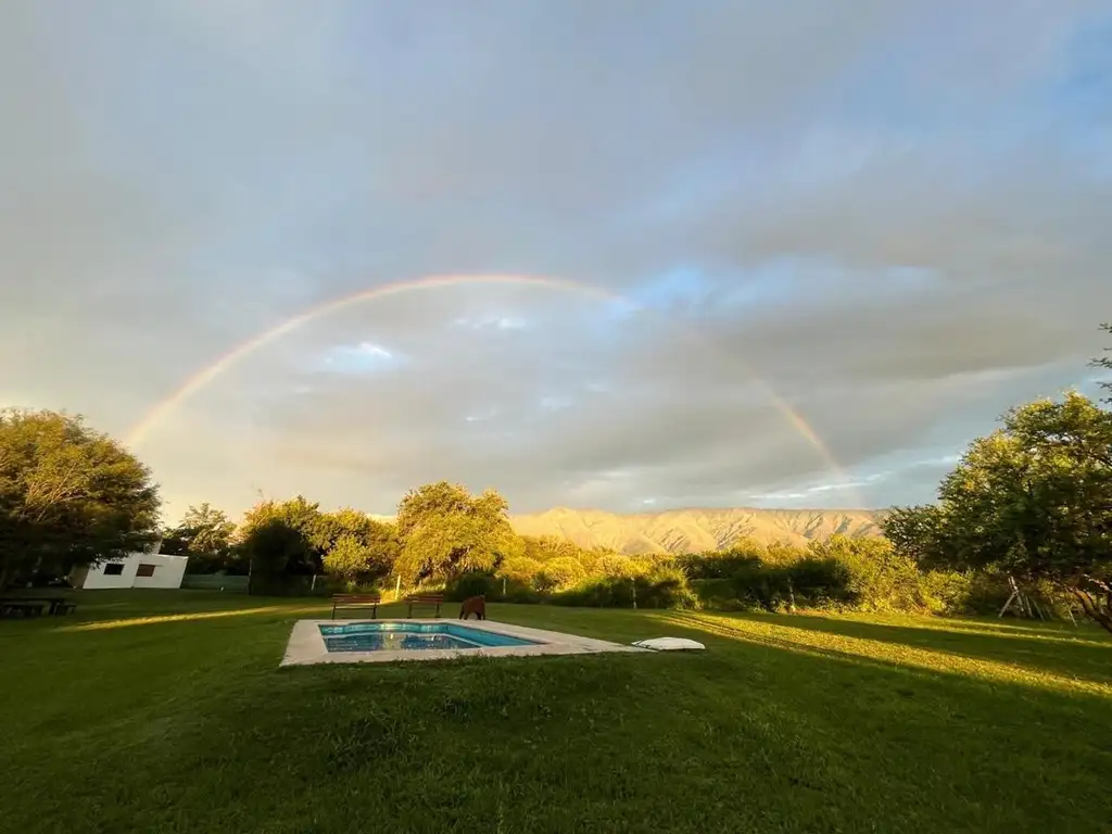 Casa Quinta, con muy linda vista al Champaqui. Cuenta con tres dormitorios, dos baños, terraza, galeria, living comedor, cocina completa con microondas, pava eléctrica, tostadora, cafetera, licuadora, piscina 4 x 9 mts, parque de 1 ha. Parrilla, Wifi Star Link, Tv, Ropa de cama, no incluye toallas, juegos para chicos.