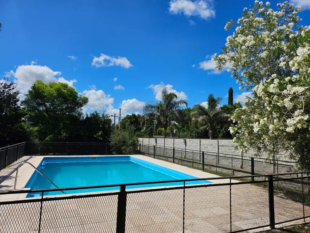 Piscina cercada e iluminada de 10x6mts va de 1 a 2.80mts aprox. De profundidad. Equipada con skimmer, jets, bomba y filtro. Con solarium y ducha. Toillete en el parque.