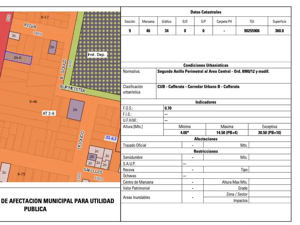 El terreno permite una altura máxima de 30.5 metros, lo que posibilita la construcción de planta baja más 10 pisos, ofreciendo un gran potencial para proyectos residenciales o comerciales. Su ubicación estratégica en Cafferata 900 proporciona un fácil acceso a servicios y transporte.